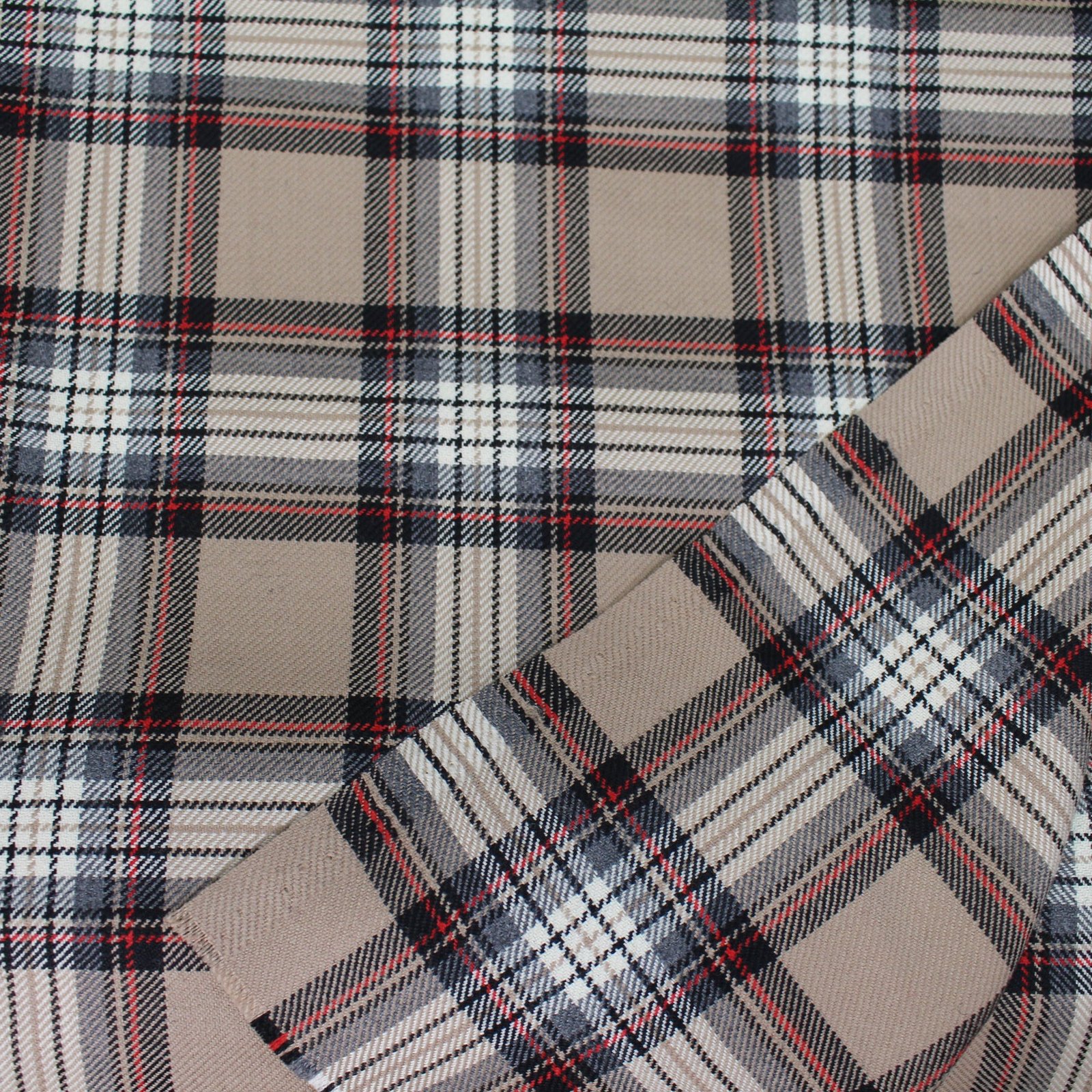 Classic Beige & Grey Tartan Plaid woven with sophisticated red highlights. This premium 100% yarn-dyed cotton fabric combines traditional aesthetics with modern industrial durability.