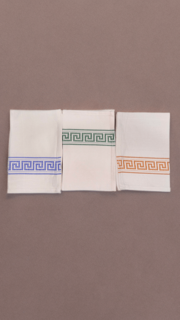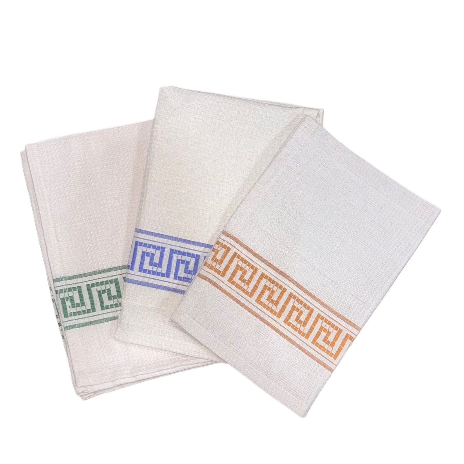 Elevate your kitchen essentials with this premium cotton kitchen towels. Designed with a timeless Greca border and waffle weave texture, these towels combine absorbency, durability, and style for everyday kitchen use.
